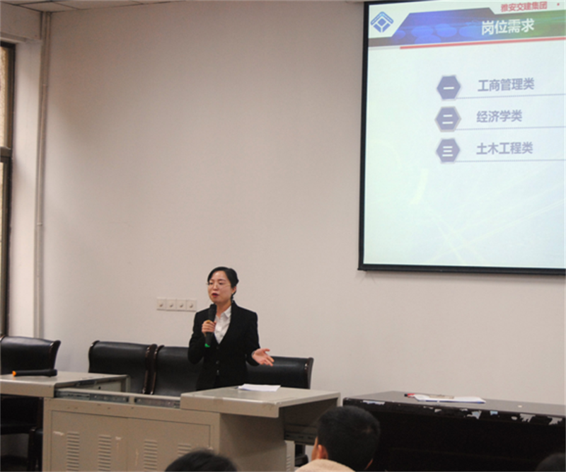 11月15日,由雅安市委、市政府主辦,雅安市委組織部、雅安市委機(jī)構(gòu)編制委員會(huì)辦公室、雅安市人力資源和社會(huì)保障局承辦的2018年“雅州英才”工程赴外招才引智高校行活動(dòng)走進(jìn)四川大學(xué)(望江校區(qū)),交建集團(tuán)招聘代表參加了現(xiàn)場宣講活動(dòng)。