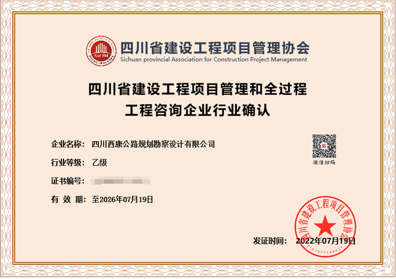 日前,經(jīng)四川省建設(shè)工程項目管理協(xié)會評審,交建集團四川西康公路規(guī)劃勘察設(shè)計有限公司獲得“四川省建設(shè)工程項目管理和全過程工程咨詢企業(yè)行業(yè)乙級資格”確認(rèn),成為四川省內(nèi)為數(shù)不多獲得開展全過程項目管理和咨詢資質(zhì)企業(yè)之一。