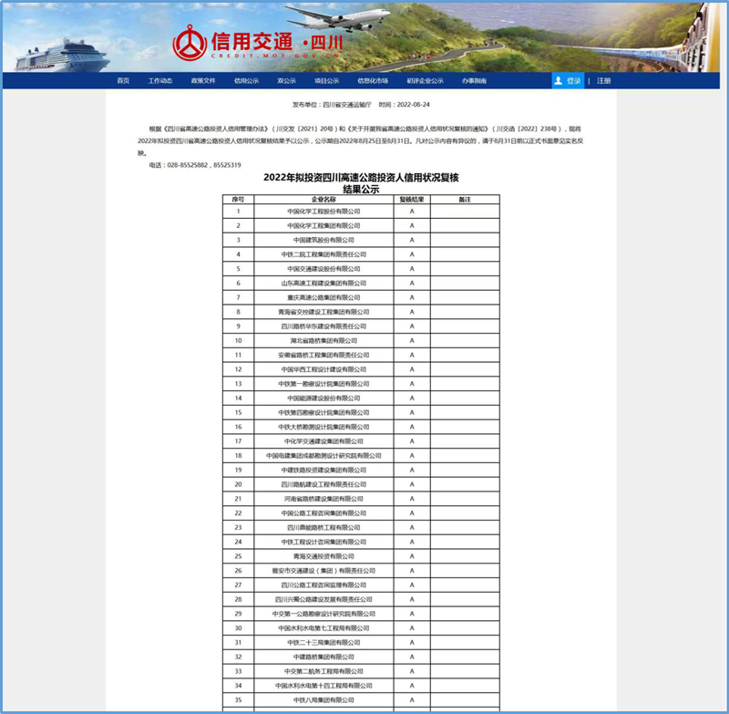 近日,四川省交通運輸廳“信用交通(四川)”公示2022年擬投資四川省高速公路投資人信用狀況復核結(jié)果和2022年第3批擬投資四川省高速公路投資人初次信用評價結(jié)果,雅安市交通建設(集團)有限責任公司及下屬全資子公司四川康藏路橋有限責任公司獲得“A”級信用評價。