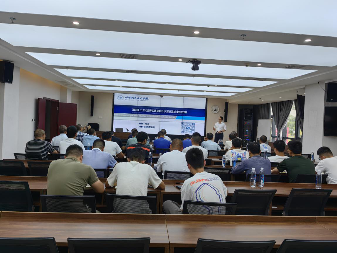 培訓邀請綿陽職業(yè)技術學院材料與建造學院院長賈陸軍、蔣勇兩位博士授課,重點圍繞配合比設計中需注意的事項展開,詳細講解配合比設計要點,分析原材料選擇及礦粉、粉煤灰摻合料摻配比例的重要性,總結(jié)交流機制砂在混凝土中的應用技術,講解混凝土外加劑基礎知識、分析目前外加劑在使用過程中適應性問題和原因,通過真實案例分析混凝土質(zhì)量問題的原因及管控要點等。