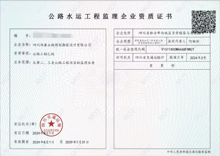 近日,經(jīng)四川省交通運輸廳批準,雅安交建集團勘察設計公司成功取得公路工程監(jiān)理乙級資質(zhì),該資質(zhì)的成功獲批,標志著我公司業(yè)務邁向新領域。