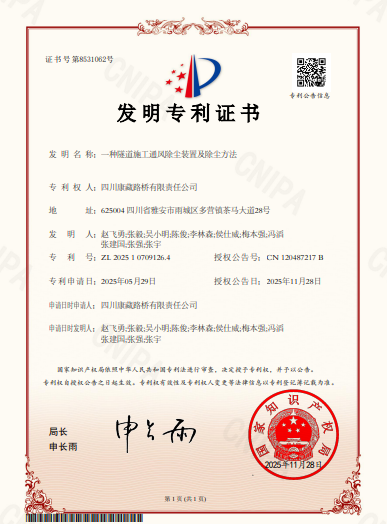 近日,康藏路橋公司申報的《一種隧道施工通風除塵裝置及除塵方法》(專利號:ZL 2025 1 0709126.4)成功獲得國家知識產(chǎn)權(quán)局頒發(fā)的發(fā)明專利授權(quán),標志著康藏路橋公司在核心技術(shù)創(chuàng)新與自主知識產(chǎn)權(quán)高階布局領域邁出關鍵一步。