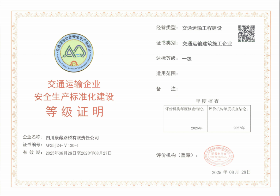 近日,經(jīng)交通運(yùn)輸部交通運(yùn)輸企業(yè)安全生產(chǎn)標(biāo)準(zhǔn)化評價(jià)機(jī)構(gòu)綜合評定,康藏路橋公司獲評安全標(biāo)準(zhǔn)化一級企業(yè)并取得證書,標(biāo)志其安全生產(chǎn)管理體系獲國家最高標(biāo)準(zhǔn)認(rèn)可。
