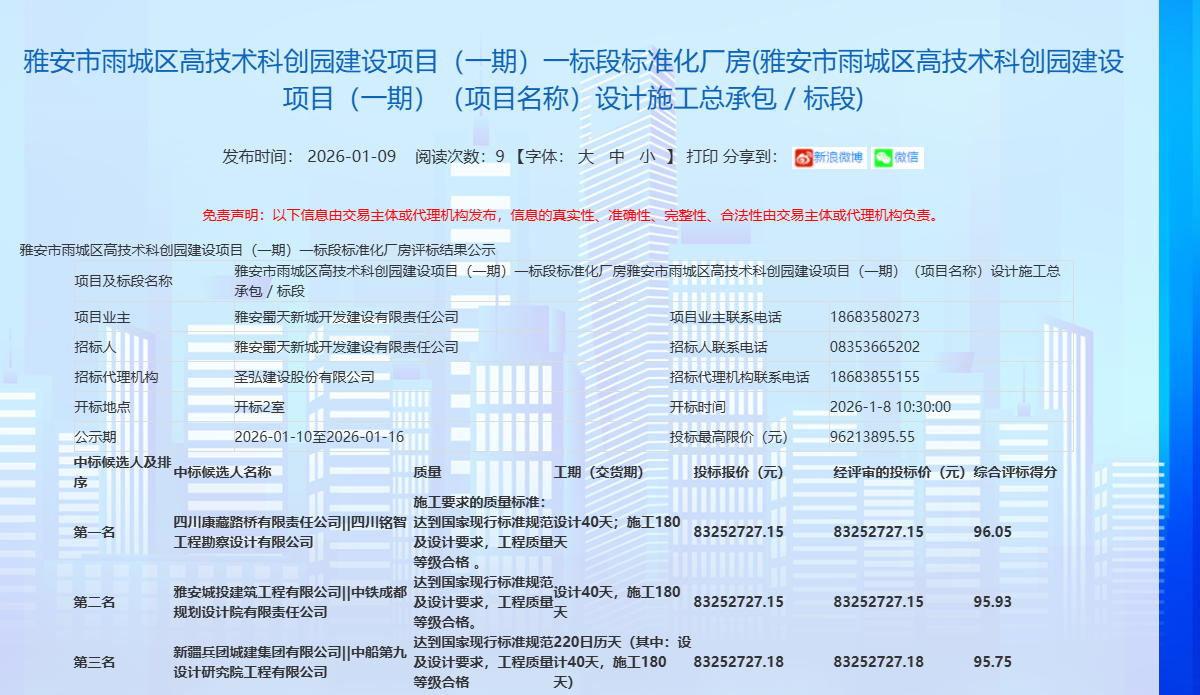 蓄勢突破,奮楫開新?挡芈窐蚬境晒孬@雅安市雨城區(qū)高技術(shù)科創(chuàng)園建設項目(一期)一標段標準化廠房項目,中標金額8325.27萬元,為公司2026年發(fā)展強勢開篇,迎來馬年“開門紅”。