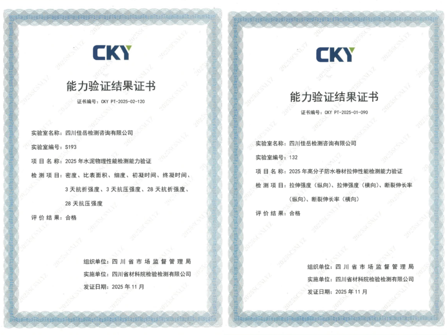 近日,佳岳公司順利完成2025年度檢測能力驗證工作,“高分子防水卷材拉伸性能檢測”與“水泥物理性能檢測”兩項項目結果均獲“滿意”評價。