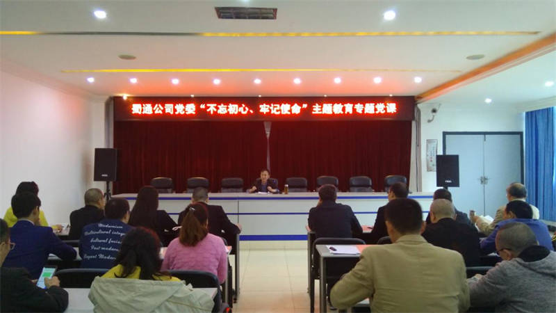 10月24日,公司黨委“不忘初心、牢記使命”主題教育專題黨課在蜀通公司機(jī)關(guān)大會(huì)議室舉行,公司黨委書(shū)記吳誠(chéng)向蜀通公司、公交公司黨員講專題黨課。公司黨支部書(shū)記、和黨員代表共35人參加。