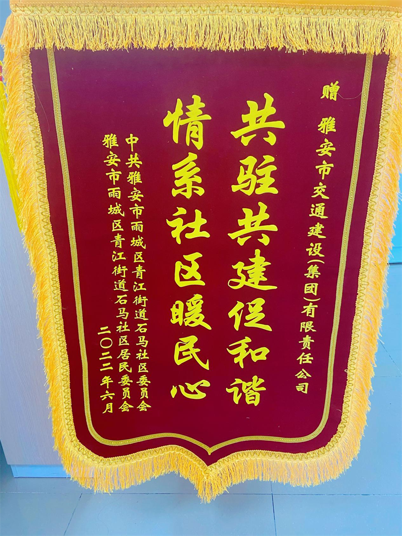 6月29日,雅安市交建集團作為石馬社區(qū)結(jié)對共建先進(jìn)單位,受邀參加了中共雅安市雨城區(qū)青江街道石馬社區(qū)工作委員會組織召開的慶祝建黨101周年大會暨2022年度先進(jìn)表彰大會,石馬社區(qū)黨委書記周麗娟同志為交建集團贈送“情系社區(qū)解難事 共駐共建促和諧”錦旗。