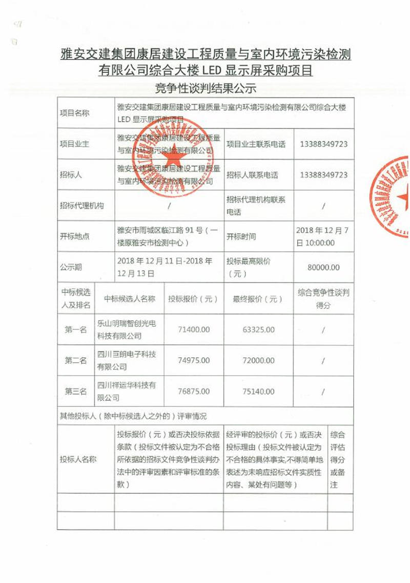 綜合大樓LED顯示屏采購(gòu)項(xiàng)目競(jìng)爭(zhēng)性談判結(jié)果公示