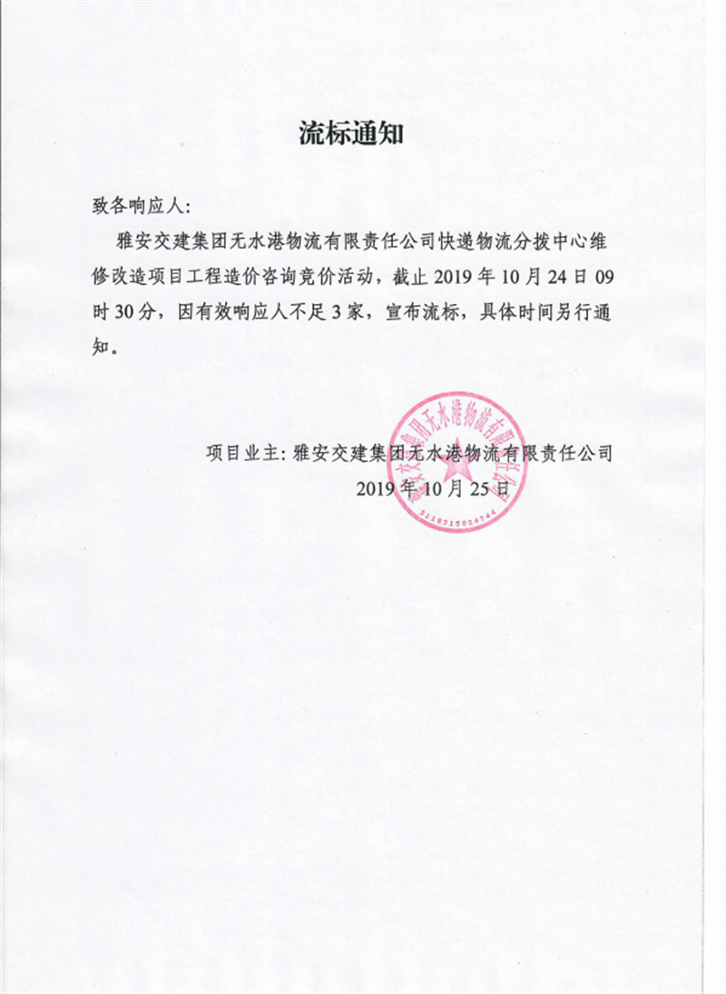 雅安交建集團無水港物流有限責任公司快遞物流分撥中心維修改造項目工程造價咨詢競價流標通知