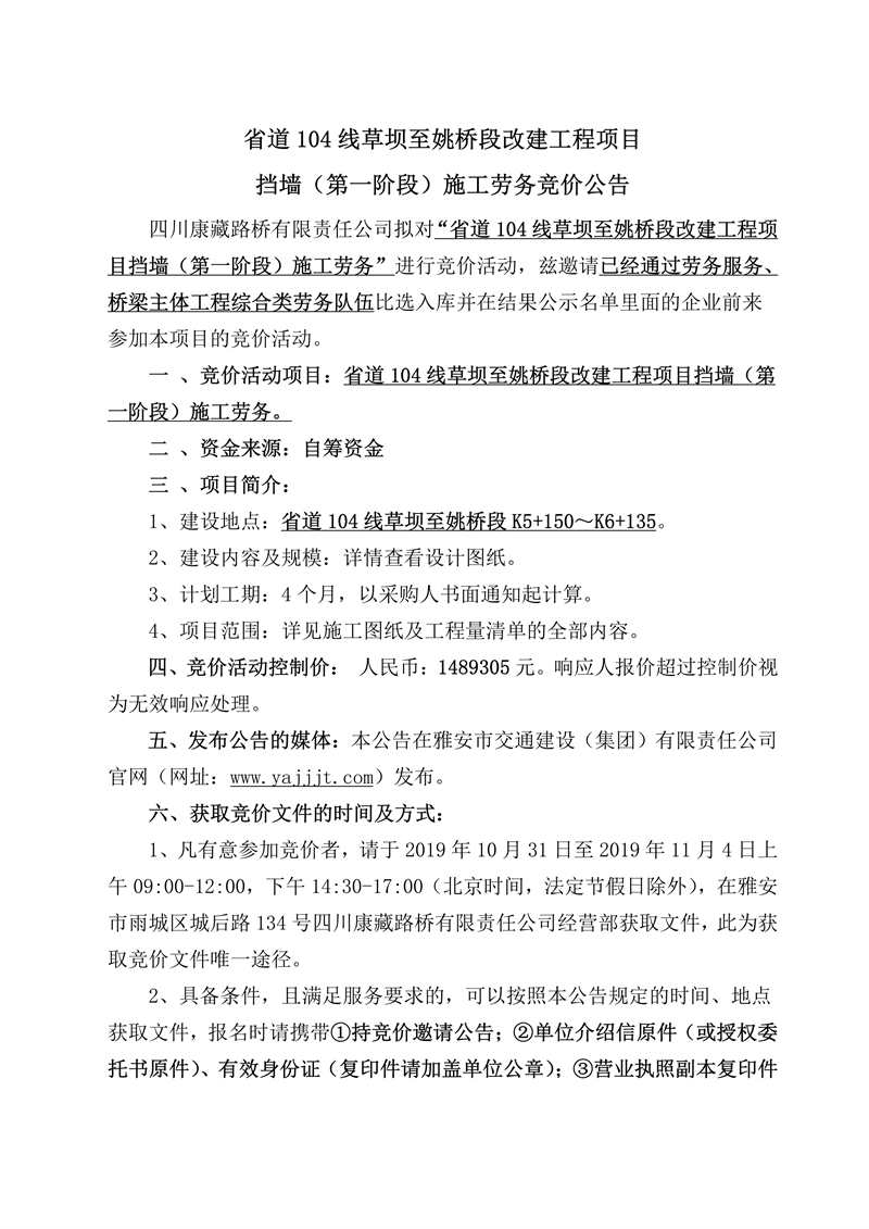 四川康藏路橋有限責(zé)任公司省道104線草壩至姚橋段改建工程項(xiàng)目擋墻(第一階段)施工勞務(wù)競價(jià)公告