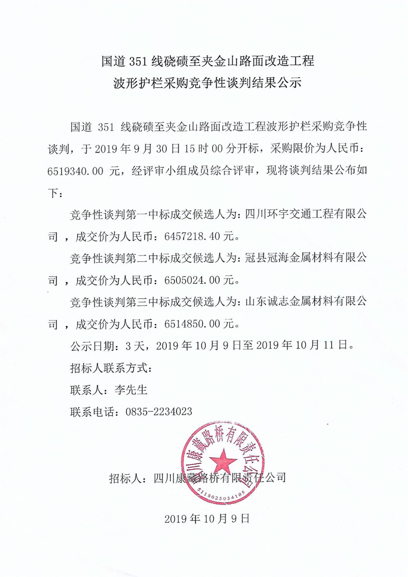 四川康藏路橋有限責(zé)任公司國(guó)道351線磽磧至夾金山路面改造工程波形護(hù)欄采購(gòu)競(jìng)爭(zhēng)性談判結(jié)果公示