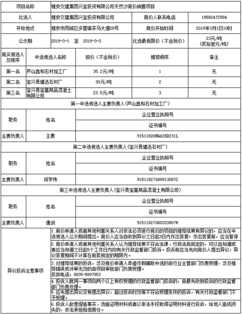 雅安交建集團興寶投資有限公司天然沙競價銷售項目公示