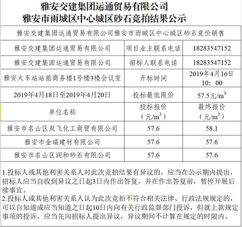 雅安交建集團運通貿(mào)易有限公司中心城區(qū)砂石競拍結(jié)果公示