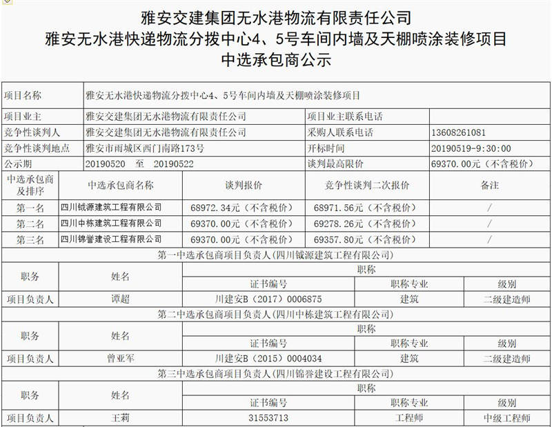 雅安無水港快遞物流分撥中心4、5號車間內(nèi)墻及天棚噴涂裝修項目中選承包商公示