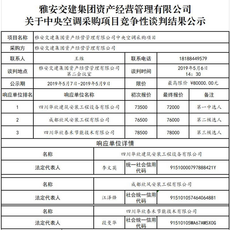 雅安交建集團(tuán)資產(chǎn)經(jīng)營(yíng)管理有限公司 關(guān)于中央空調(diào)采購(gòu)項(xiàng)目競(jìng)爭(zhēng)性談判結(jié)果公示