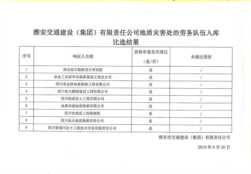 雅安交通建設(shè)(集團(tuán))有限責(zé)任公司地質(zhì)災(zāi)害處治勞務(wù)隊(duì)伍入庫比選結(jié)果