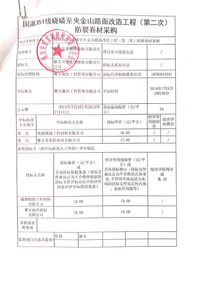 雅安交建集團路橋有限責(zé)任公司國道351線磽磧至夾金山路面改造工程(第二次)防裂卷材采購競爭性談判結(jié)果公示