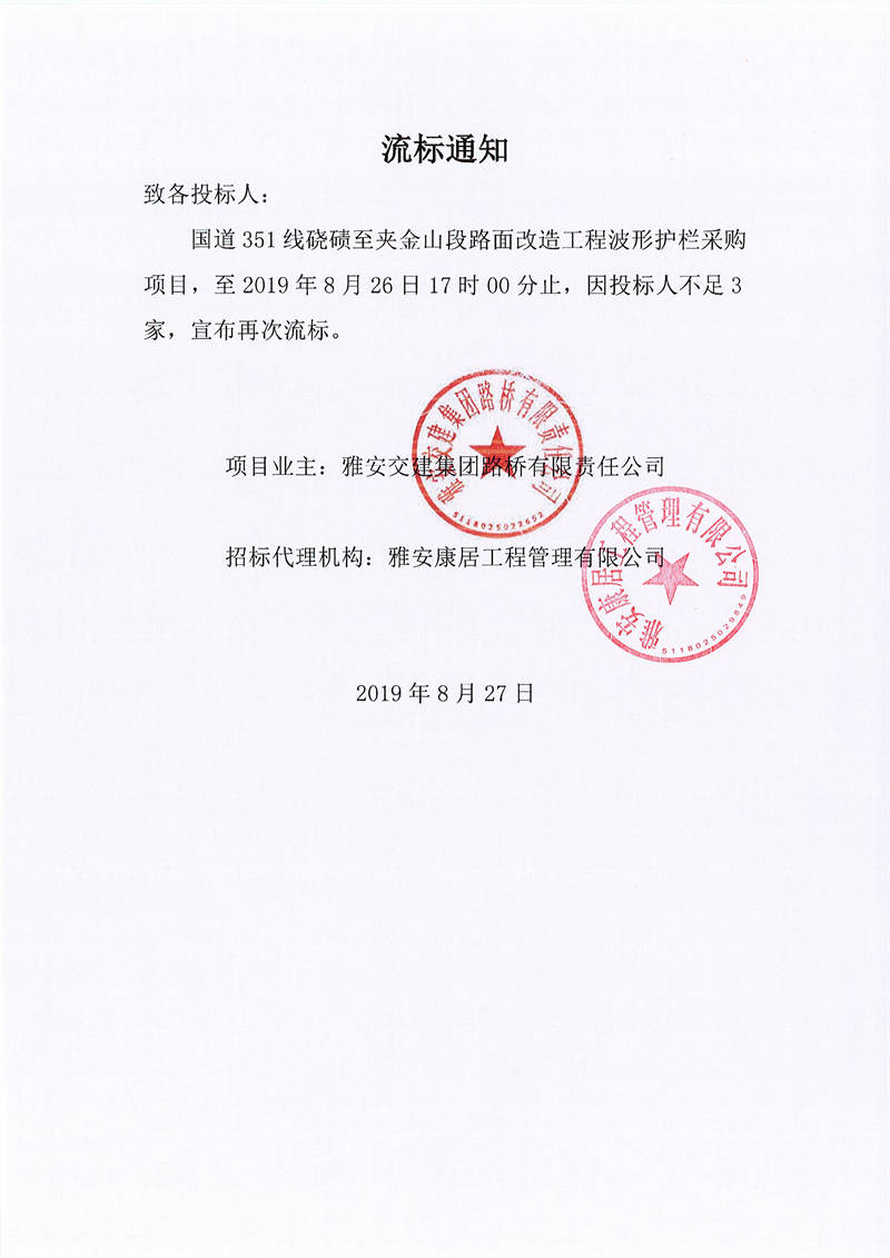 雅安交建集團路橋有限責任公司國道351線蹺磧至夾金山段路面改造工程波形護欄采購項目流標通知