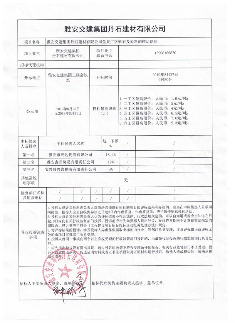 雅安交建集團(tuán)丹石建材有限公司魚(yú)泉廠區(qū)砂石及原料的轉(zhuǎn)運(yùn)隊(duì)伍項(xiàng)目競(jìng)價(jià)結(jié)果公示