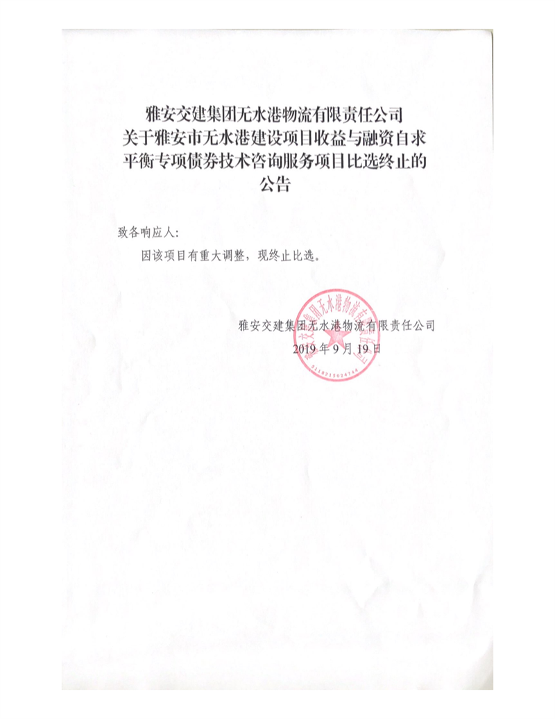 雅安交建集團(tuán)無(wú)水港物流有限責(zé)任公司關(guān)于雅安市無(wú)水港建設(shè)項(xiàng)目收益與融資自求平衡專項(xiàng)債券技術(shù)咨詢服務(wù)項(xiàng)目比選終止的公告