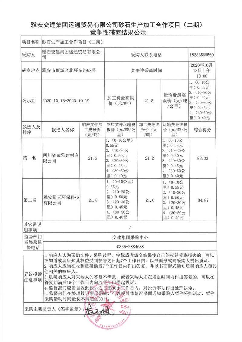 雅安交建集團運通貿易有限公司砂石生產加工合作項目(二期)競爭性磋商結果公示