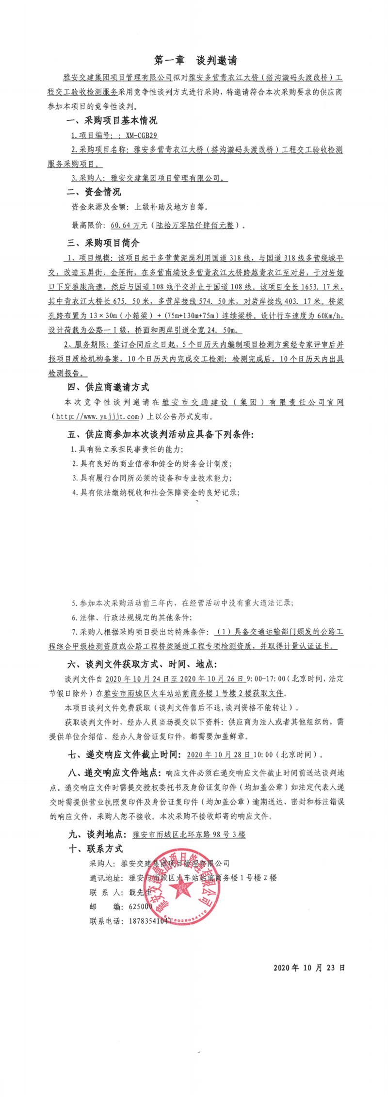 雅安交建集團(tuán)項(xiàng)目管理有限公司雅安多營(yíng)青衣江大橋(搭溝漩碼頭渡改橋)工程交工驗(yàn)收檢測(cè)服務(wù)采購(gòu)項(xiàng)目競(jìng)爭(zhēng)性談判公告