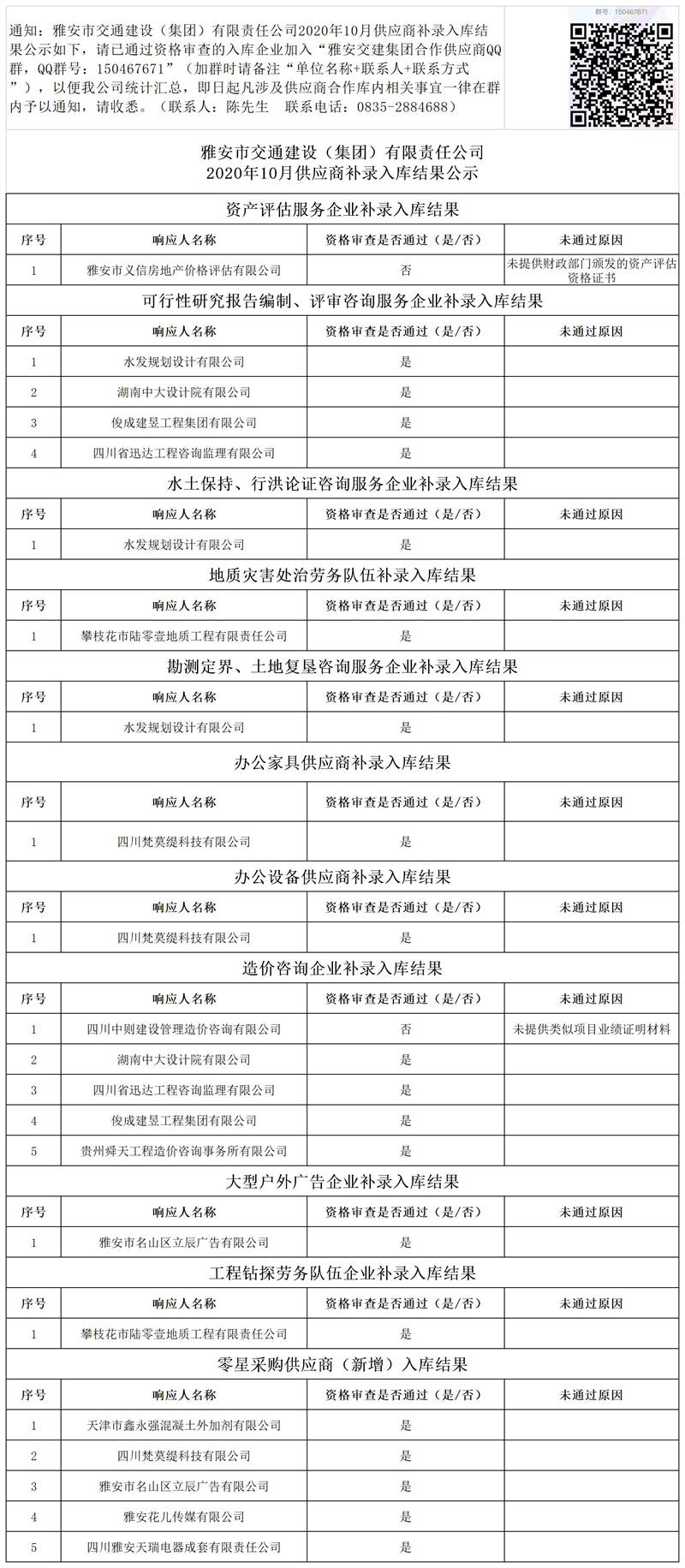 雅安市交通建設(集團)有限責任公司2020年10月供應商補錄入庫結果公示