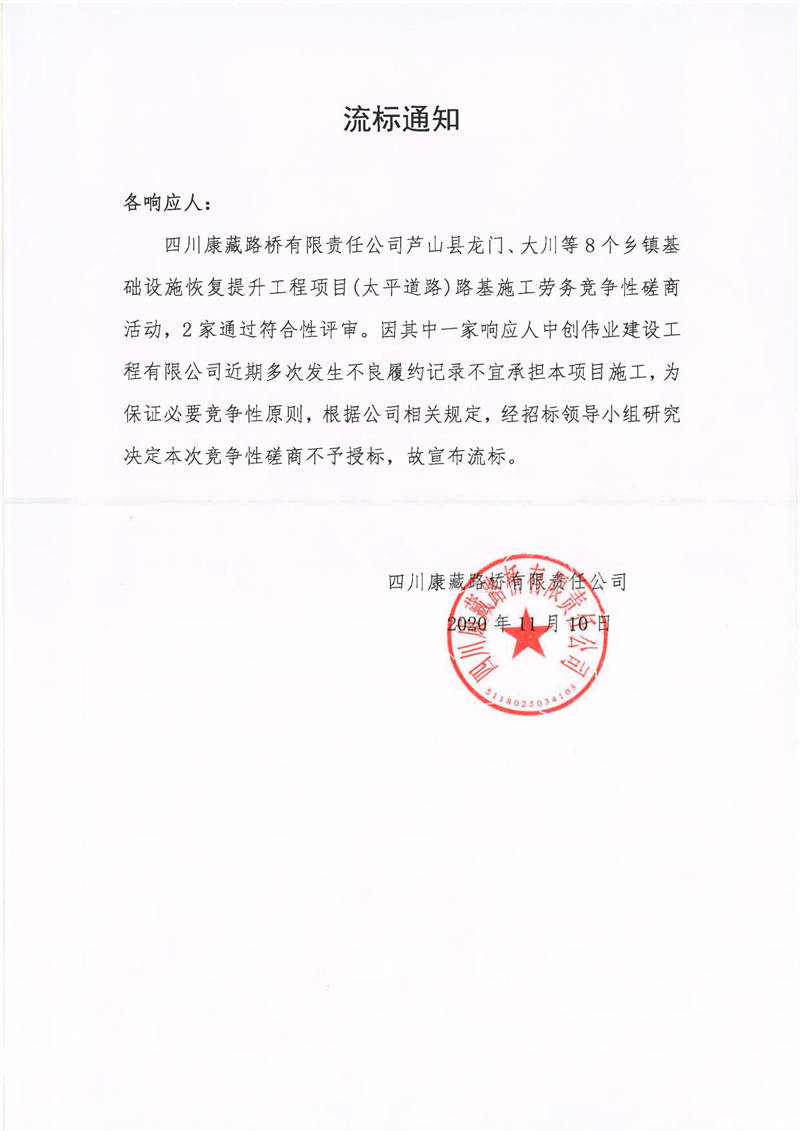 四川康藏路橋有限責(zé)任公司蘆山縣龍門、大川等8個(gè)鄉(xiāng)鎮(zhèn)基礎(chǔ)設(shè)施恢復(fù)提升工程項(xiàng)目(太平道路)路基施工勞務(wù)流標(biāo)通知