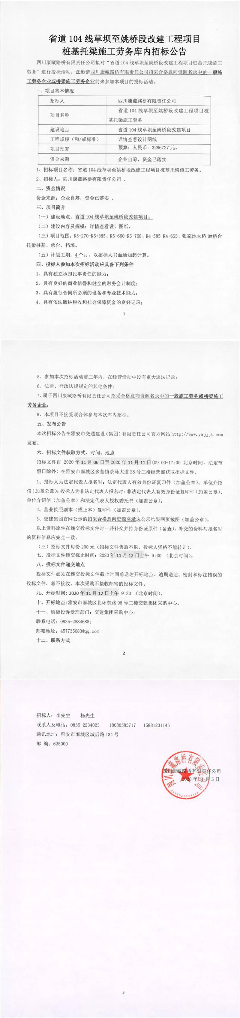 四川康藏路橋有限責(zé)任公司省道104線(xiàn)草壩至姚橋段改建工程項(xiàng)目樁基托梁施工勞務(wù)庫(kù)內(nèi)招標(biāo)公告