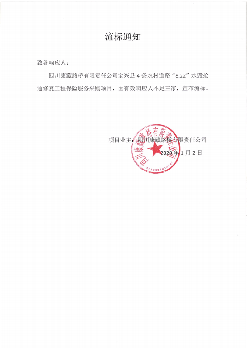 四川康藏路橋有限責任公司寶興縣4條農(nóng)村道路“8.22”水毀搶通修復工程保險服務采購項目流標通知
