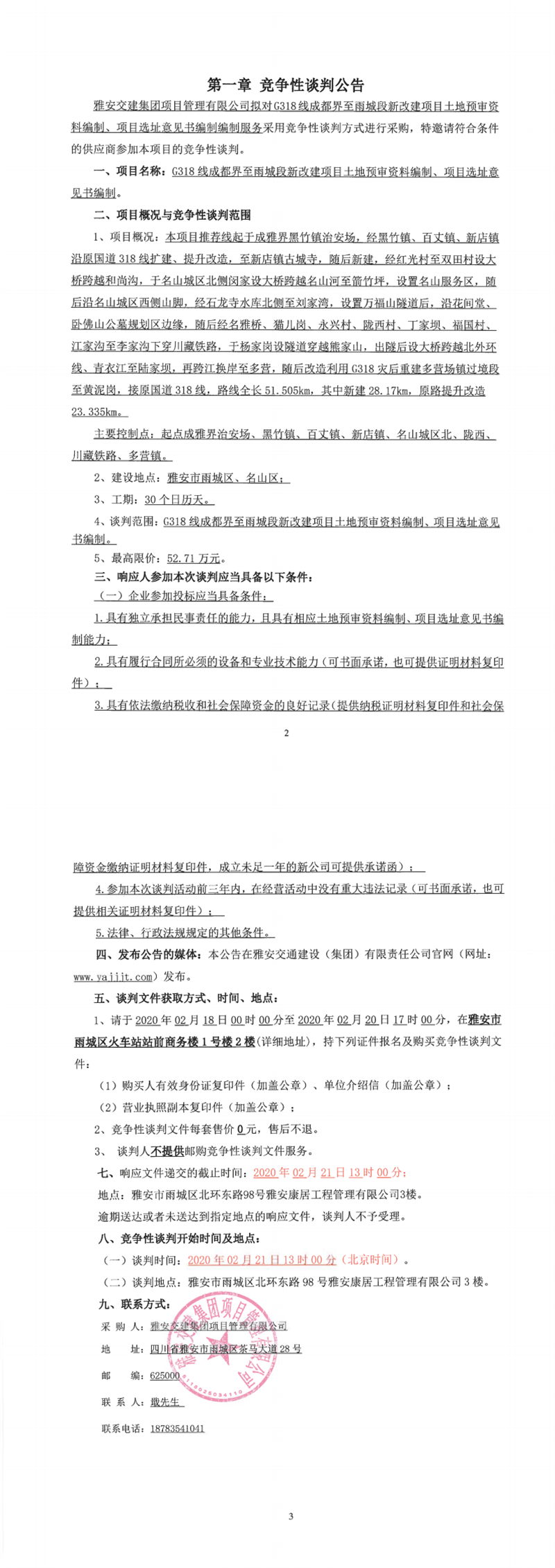 雅安交建集團項目管理有限公司G318線成都界至雨城段新改建項目土地預審資料編制、項目選址意見書編制競爭性談判公告