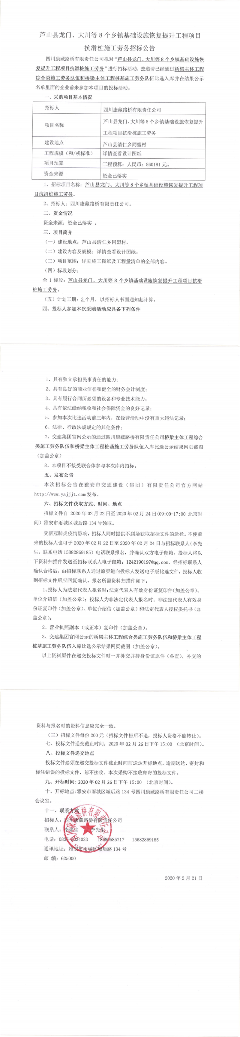四川康藏路橋有限責(zé)任公司蘆山縣龍門、大川等8個鄉(xiāng)鎮(zhèn)基礎(chǔ)設(shè)施恢復(fù)提升工程項目抗滑樁施工勞務(wù)招標(biāo)公告