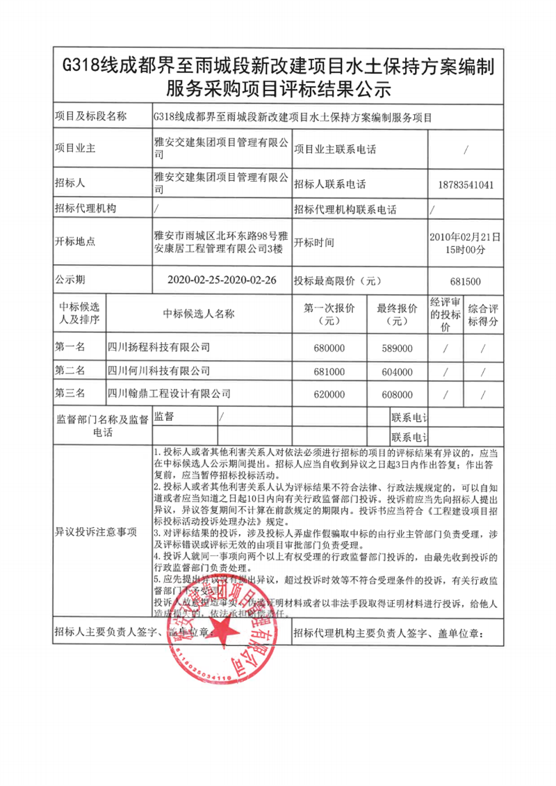 雅安交建集團項目管理有限公司G318線成都界至雨城段新改建項目水土保持方案編制服務(wù)采購項目評標(biāo)結(jié)果公示