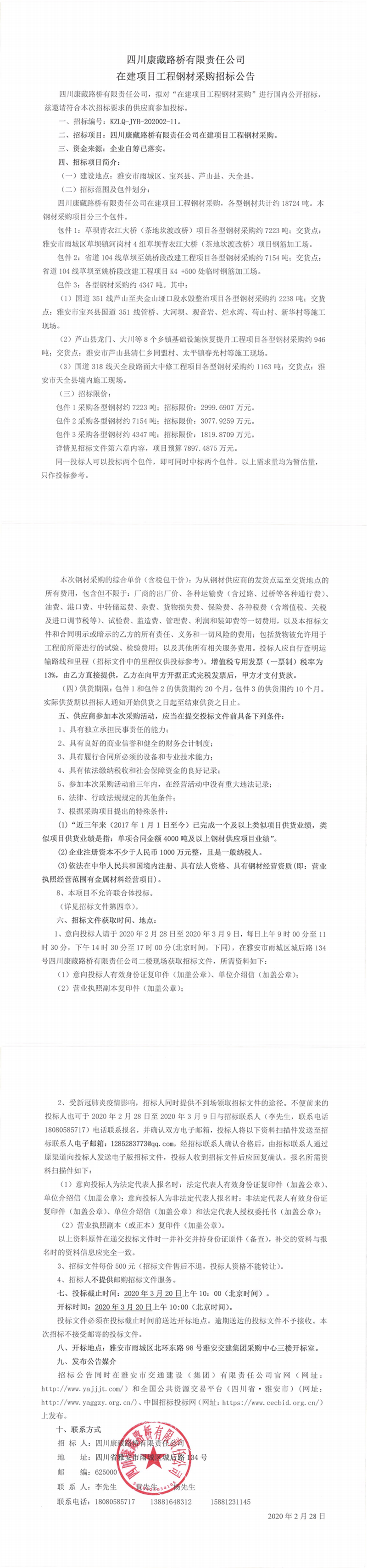 四川康藏路橋有限責(zé)任公司在建項目工程鋼材采購招標公告