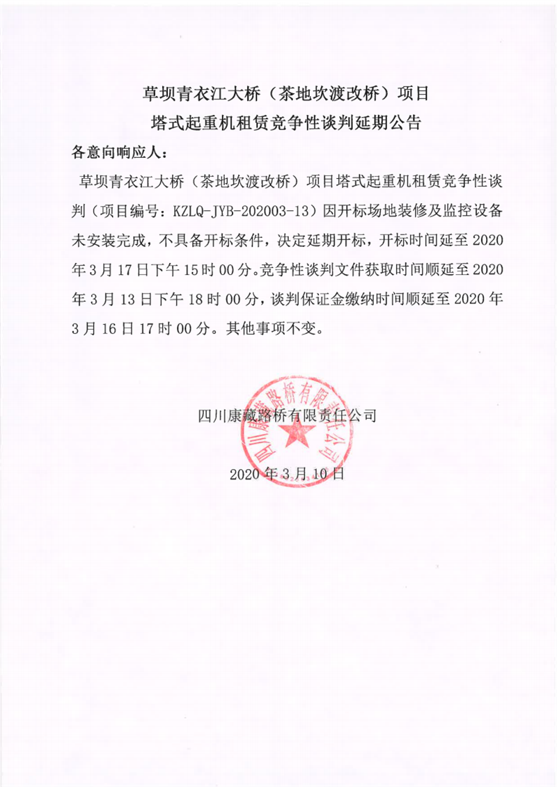 四川康藏路橋有限責(zé)任公司草壩青衣江大橋(茶地坎碼頭渡改橋)項目塔式起重機(jī)租賃競爭性談判延期公告