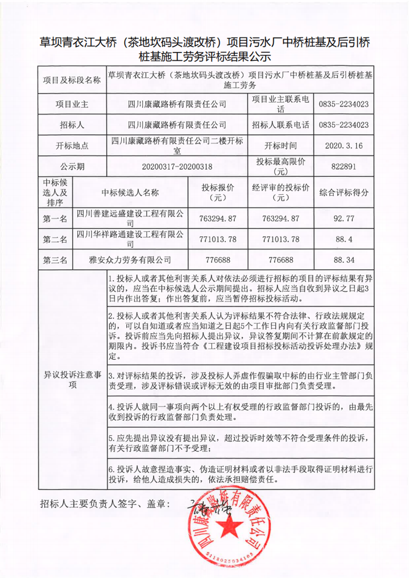 四川康藏路橋有限責(zé)任公司草壩青衣江大橋(茶地坎碼頭渡改橋)項(xiàng)目污水廠中橋樁基及后引橋樁基施工勞務(wù)評標(biāo)結(jié)果公示