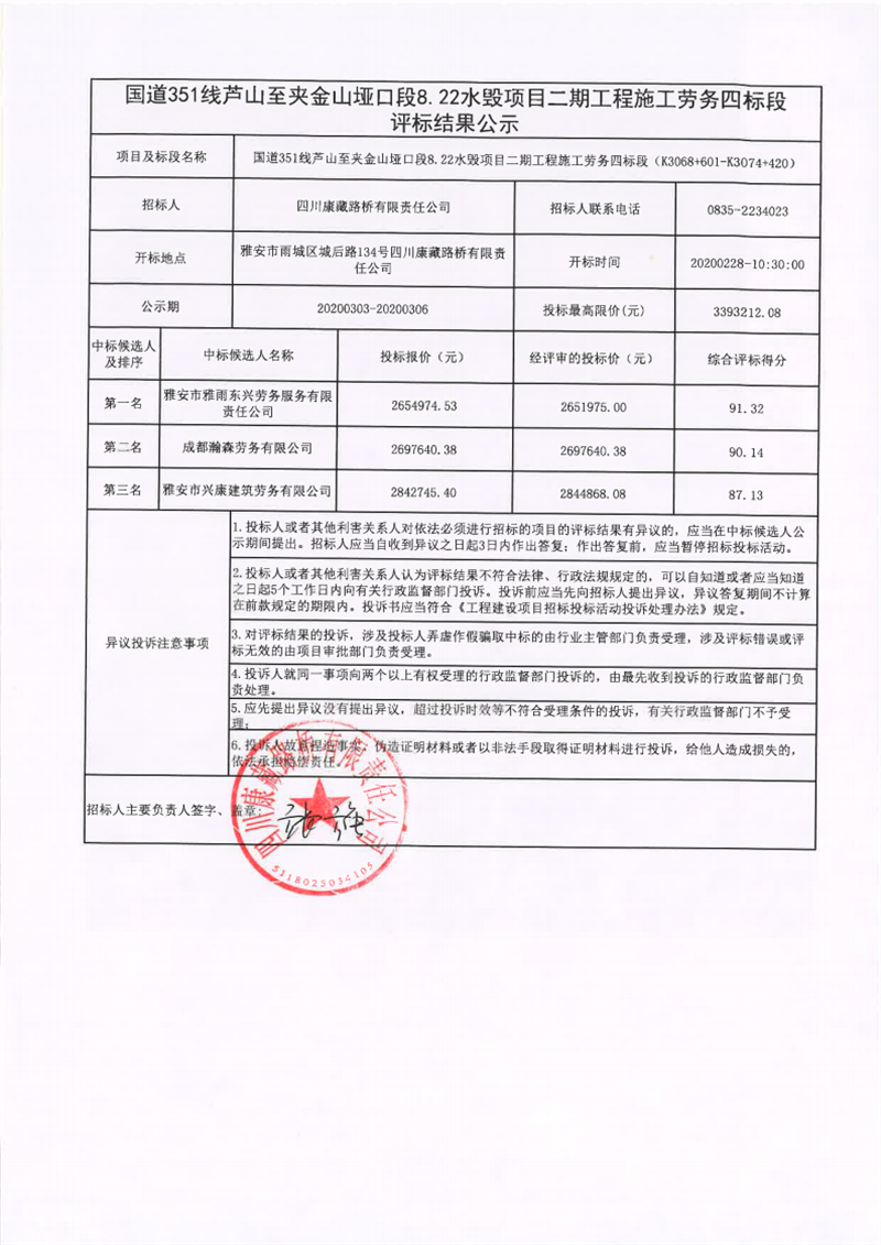 四川康藏路橋有限責任公司國道351線蘆山至夾金山埡口段8.22水毀項目二期工程施工勞務四標段評標結(jié)果公示