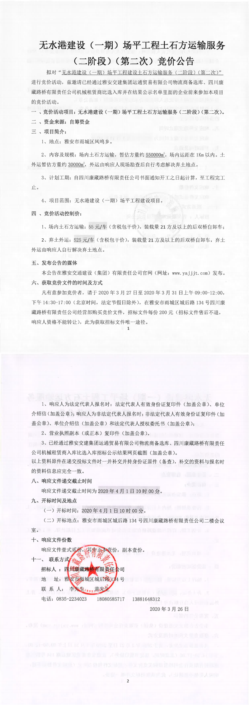 四川康藏路橋有限責任公司無水港建設(shè)(一期)場平工程建設(shè)土石方運輸服務(wù)(二階段)(第二次)競價公告