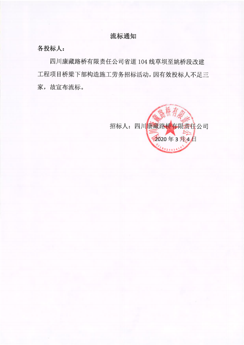 四川康藏路橋有限責(zé)任公司省道104線(xiàn)草壩至姚橋段改建工程項(xiàng)目橋梁下部構(gòu)造施工勞務(wù)流標(biāo)通知
