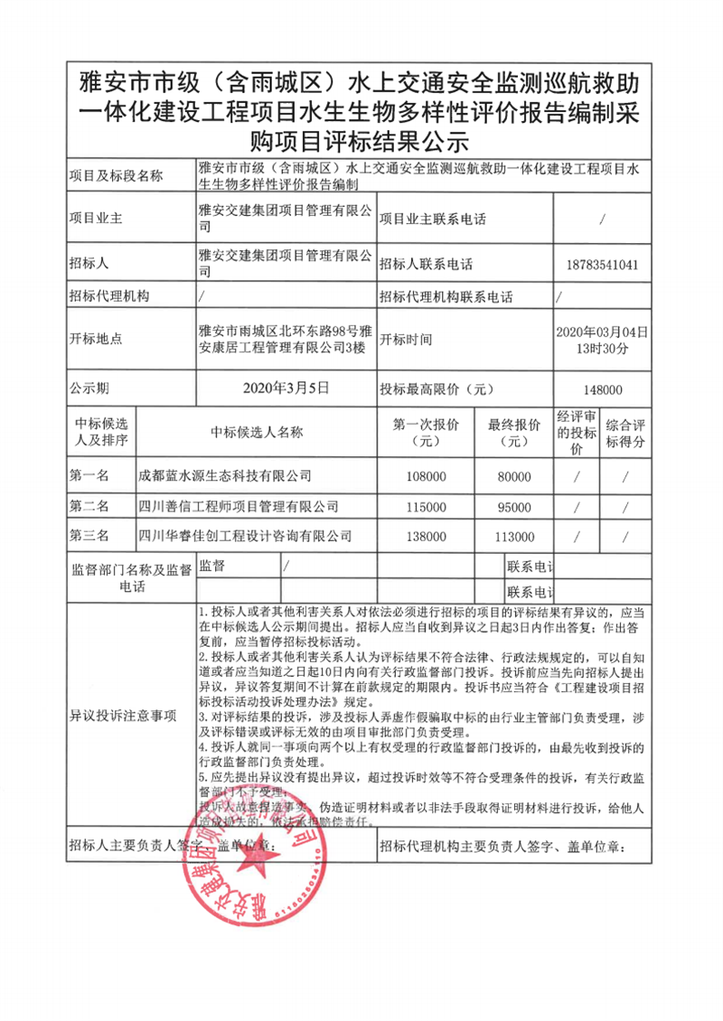 雅安交建集團(tuán)項(xiàng)目管理有限公司雅安市市級(jí)(含雨城區(qū))水上交通安全監(jiān)測巡航救助一體化建設(shè)工程項(xiàng)目水生生物多樣性評(píng)價(jià)報(bào)告編制采購項(xiàng)目評(píng)標(biāo)結(jié)果公示