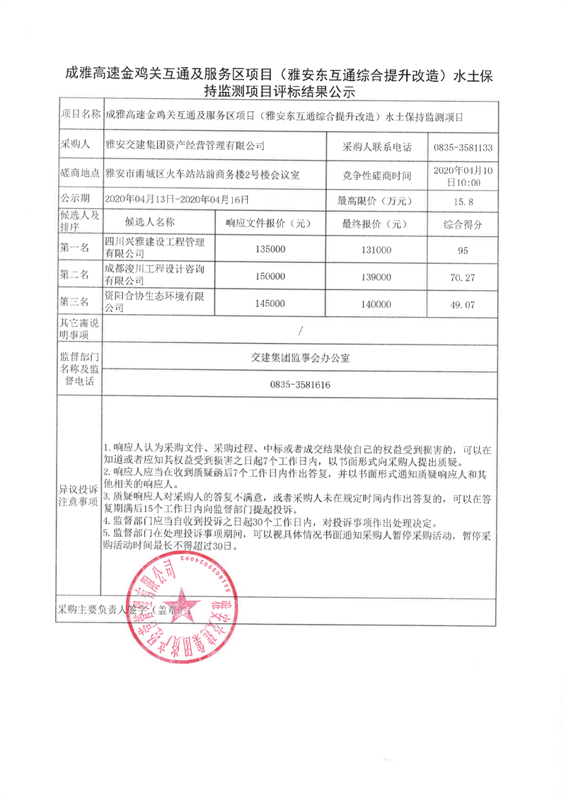 雅安交建集團資產(chǎn)經(jīng)營管理有限公司成雅高速金雞關互通及服務區(qū)項目(雅安東互通綜合提升改造)水土保持監(jiān)測項目評標結(jié)果公示