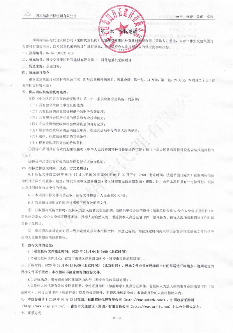 雅安交建集團(tuán)丹石建材有限公司三、四號起重機(jī)采購項(xiàng)目招標(biāo)公告