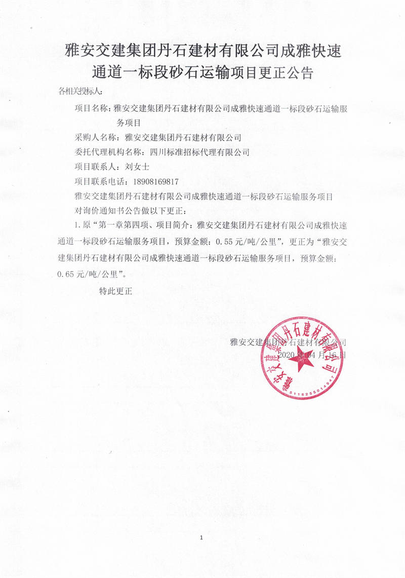 雅安交建集團(tuán)丹石建材有限公司成雅快速通道一標(biāo)段砂石運(yùn)輸服務(wù)項目更正公告
