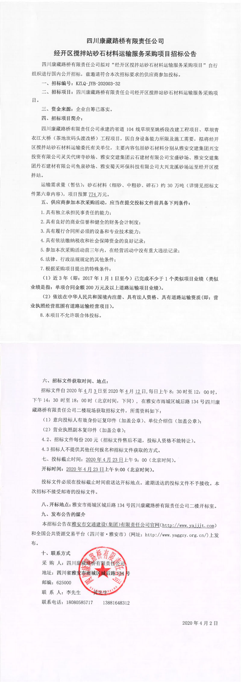 四川康藏路橋有限責(zé)任公司經(jīng)開區(qū)攪拌站砂石材料運(yùn)輸服務(wù)采購項(xiàng)目招標(biāo)公告