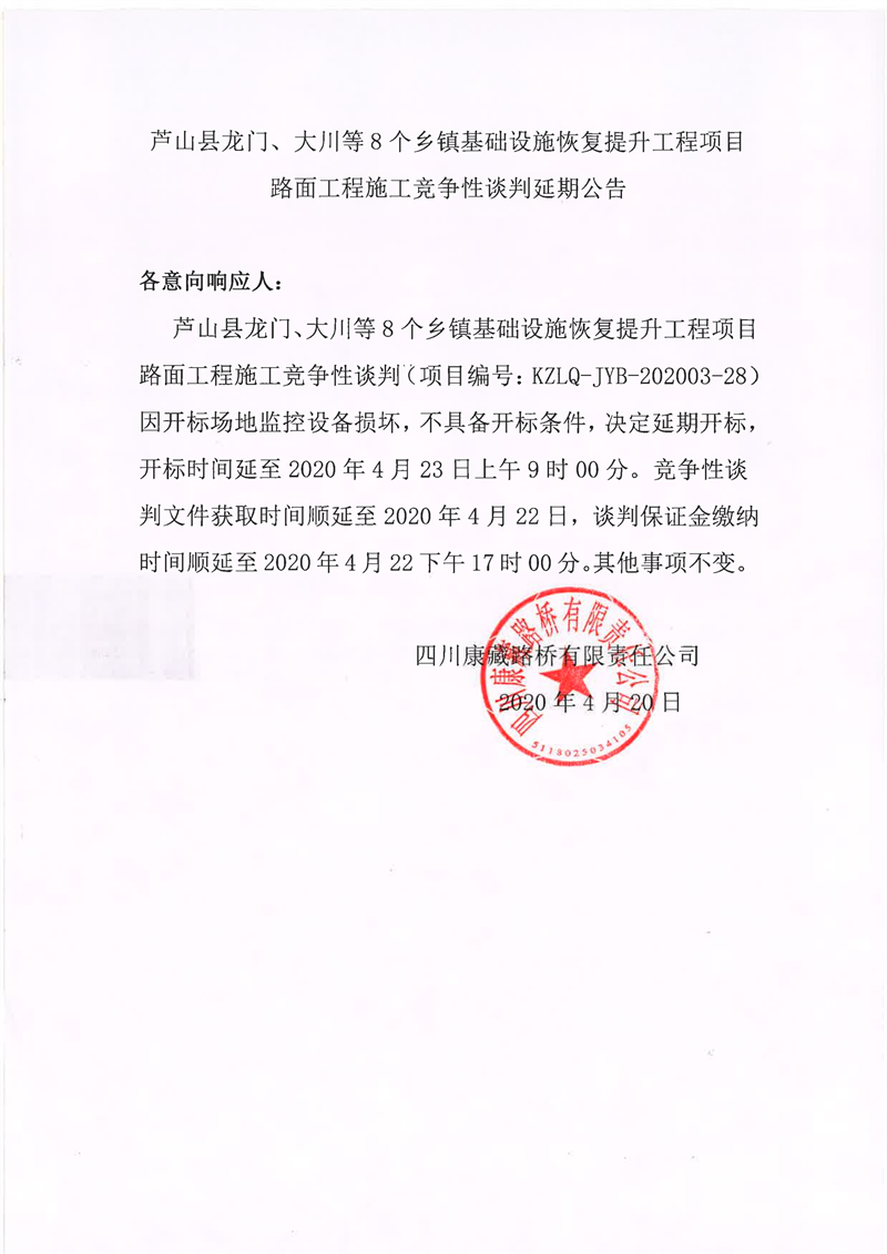 四川康藏路橋有限責(zé)任公司蘆山縣龍門(mén)、大川等8個(gè)鄉(xiāng)鎮(zhèn)基礎(chǔ)設(shè)施恢復(fù)提升工程項(xiàng)目路面工程施工競(jìng)爭(zhēng)性談判延期公告