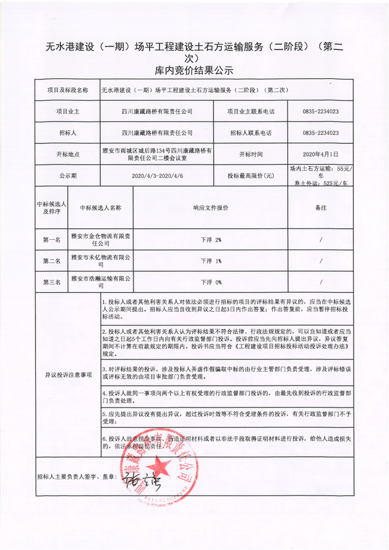 四川康藏路橋有限責任公司無水港建設(shè)(一期)場平工程土石方運輸服務(wù)(二階段)(第二次)庫內(nèi)競價結(jié)果公示