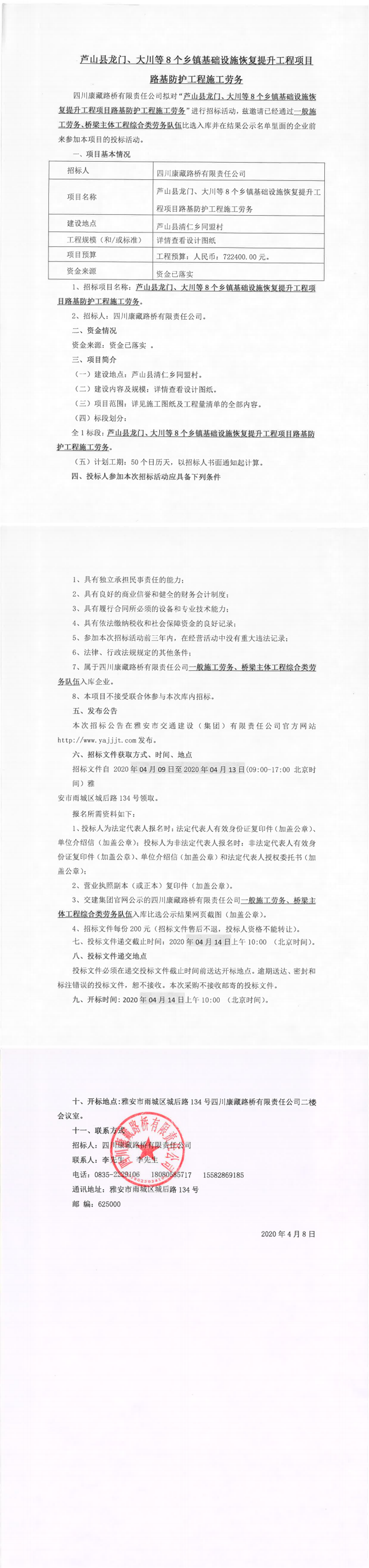 四川康藏路橋有限責(zé)任公司蘆山縣龍門、大川等8個鄉(xiāng)鎮(zhèn)基礎(chǔ)設(shè)施恢復(fù)提升工程項目路基防護工程施工勞務(wù)招標(biāo)公告