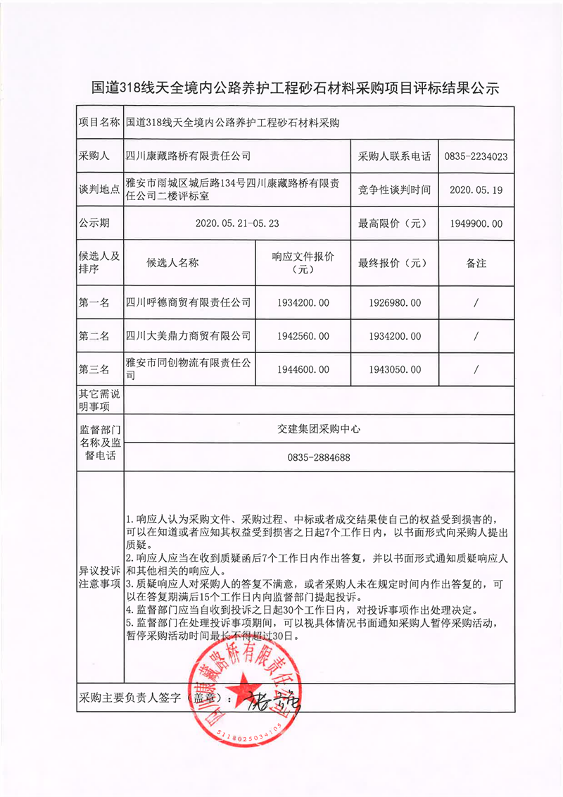 四川康藏路橋有限責(zé)任公司國道318線天全境內(nèi)公路養(yǎng)護工程砂石材料采購項目評標(biāo)結(jié)果公示