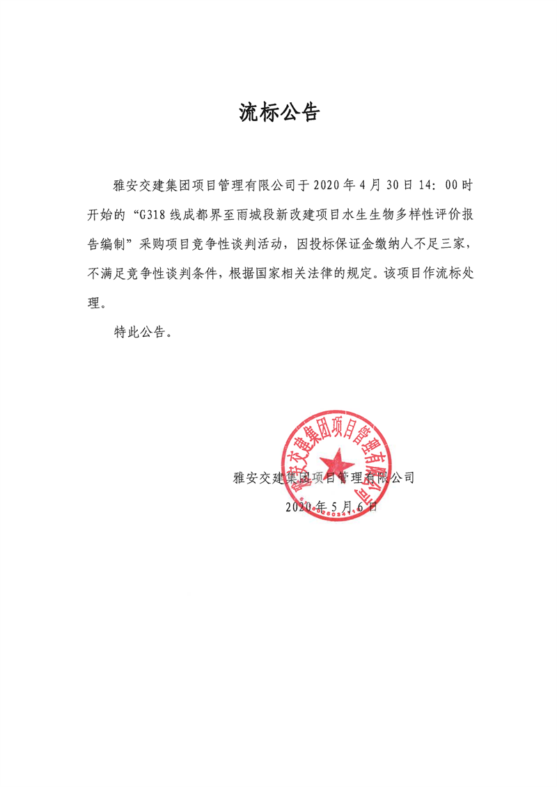 雅安交建集團(tuán)項目管理有限公司G318線成都界至雨城段新改建項目水生生物多樣性評價報告編制流標(biāo)公告