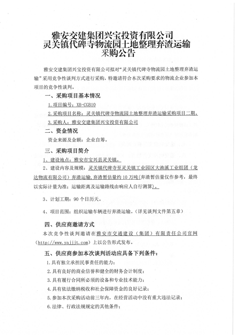 雅安交建集團(tuán)興寶投資有限公司靈關(guān)鎮(zhèn)代碑寺物流園土地整理?xiàng)壴\(yùn)輸采購項(xiàng)目二期競(jìng)爭(zhēng)性談判公告